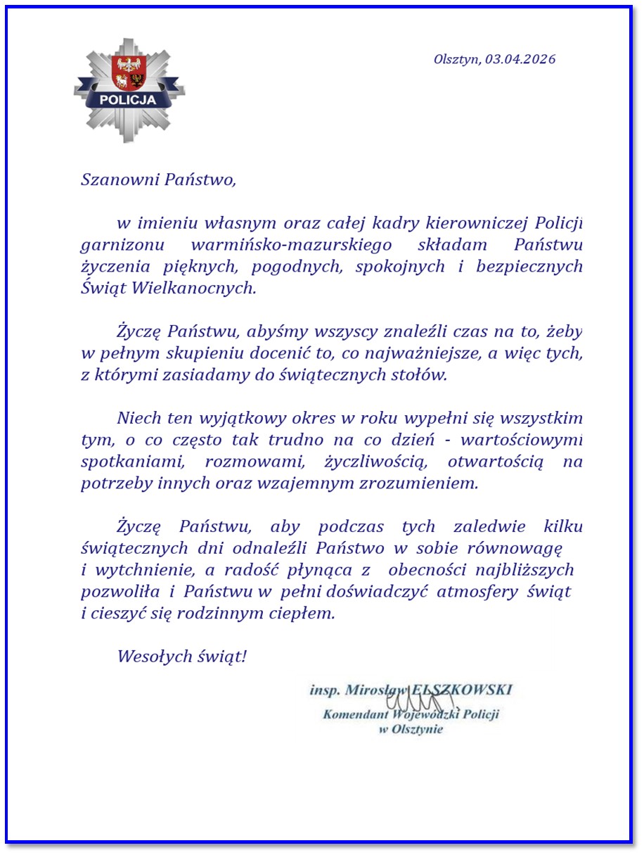 Okazją do tego spotkania były zbliżająca się Wielkanoc oraz decyzje kadrowe i wyróżnienia dla zasłużonych funkcjonariuszy. Podczas pierwszej części uroczystości insp. Mirosław Elszkowski Komendant Wojewódzki Policji w Olsztynie wręczył rozkazy personalne policjantom, którzy w ostatnich tygodniach pełnili obowiązki komendantów w Komendzie Miejskiej Policji w Elblągu oraz Komendach Powiatowych w Działdowie, Kętrzynie, Lidzbarku Warmińskim i Nidzicy. Otrzymane rozkazy o powołaniu na stanowiska potwierdziły wcześniej podjęte decyzje i ugruntowały ich pozycję w realizacji powierzonych zadań.